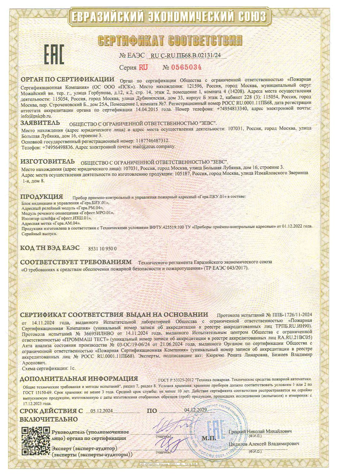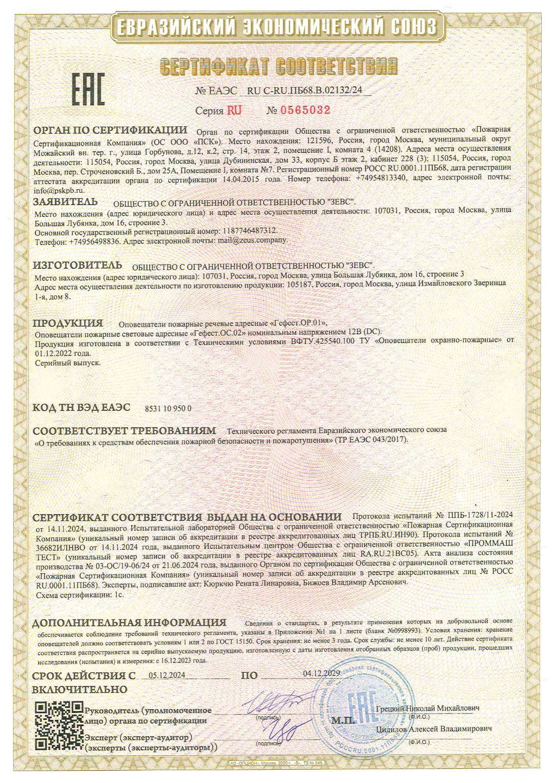 Сертификат соответствия технического регламента Евразийского экономического союза от 5 декабря 2024 г.