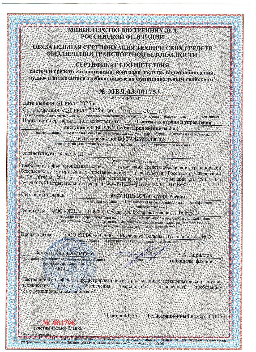 Сертификат обеспечения транспортной безопасности СТиС МВД от 31 июля 2025 г.