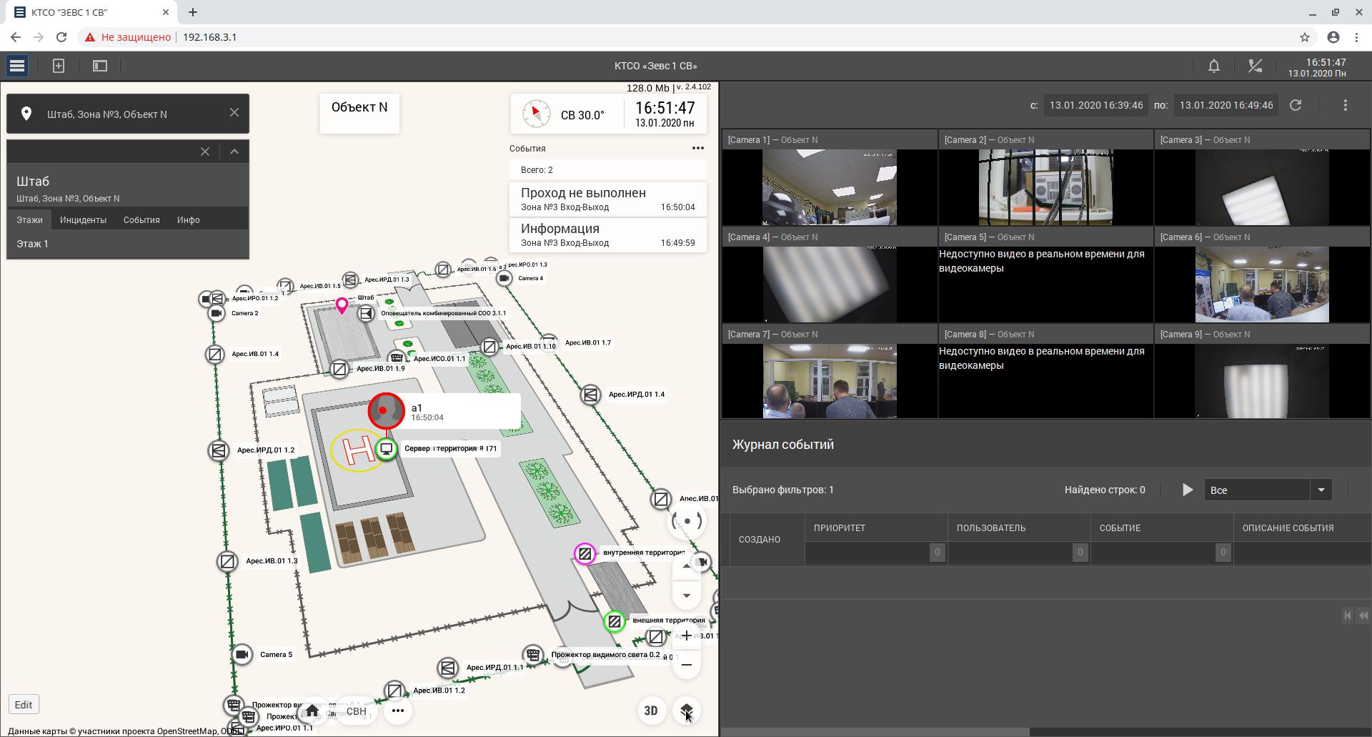 Автоматизированное рабочее место комплекса "Зевс" позволяет вращать карту объекта в трех плоскостях. Это делает план более наглядным и облегчает восприятие. Пиктограммы приборов разработаны таким образом чтобы создавать интуитивное понимание соответствия значка определенной задаче. Кроме того, пиктограммы являются интерактивными. При нажатии на пиктограмму может происходить определенное назначенное действие. Например, при выборе видеокамеры открывается окно с видеопотоком с камеры и возможностью выбора действий: увеличение, просмотр видеозаписи и т.д.
